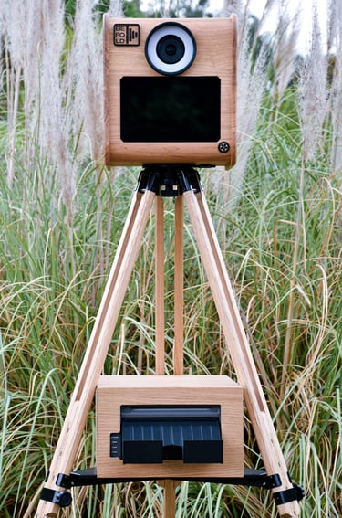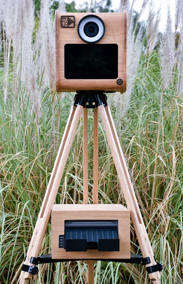 Une borne à selfie haut de gamme, de grande qualité, en chêne massif. Ultra légère et compacte, un design résolument Vintage.